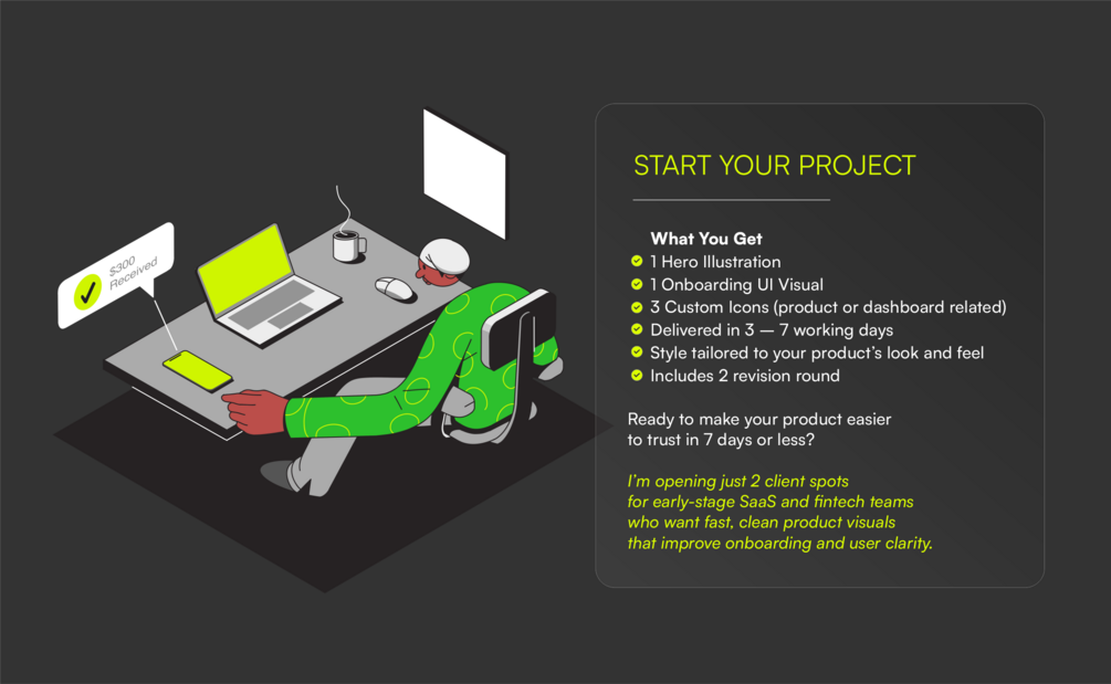 Iโm opening just 2 client spots for early-stage SaaS and fintech teams who want fast, clean product visuals that improve onboarding and user clarity.